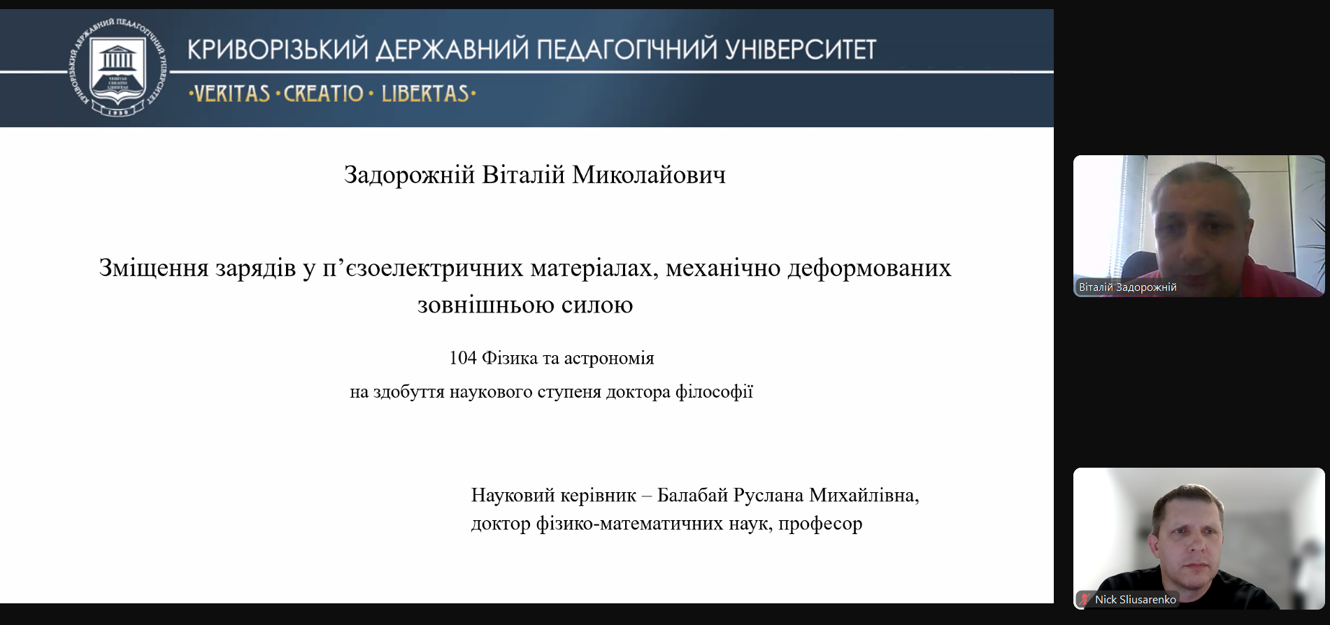 Разова Спеціалізована вчена рада Криворізького державного педагогічного університету прийняла рішення про присудження ступеня доктора філософії галузі знань 10 Природничі науки Задорожньому Віталію Миколайовичу на підставі прилюдного захисту дисертації «Зміщення зарядів у п’єзоелектричних матеріалах, механічно деформованих зовнішньою силою» за спеціальністю 104 – Фізика та астрономія 1 серпня 2025 року.