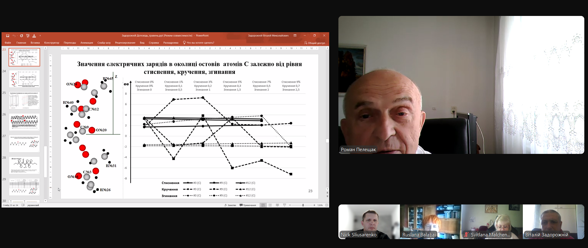 Далі, слідувало обговорення представлених Задорожнім Віталієм Миколайовичем результатів - запитання по доповіді, виступи експертів із запитаннями та зауваженнями по дисертації, виступи присутніх. Так, Пелещак Роман Михайлович, професор кафедри інформаційних систем та мереж Національного університету «Львівська політехніка» ствердив, що напрямок наукових досліджень Задорожнього Віталія актуальний, результати – достовірні, мають наукову новизну та практичну цінність, що забезпечується їх апробаціями на авторитетних міжнародних конференціях та публікаціями у скопусних виданнях. Роман Михайлович додав, що наукові пошуки здобувача здійснювалися за підтримки наукової школи «Реалістичне фізико-хімічне портретування нанорозмірних систем», яка діє на кафедрі під керівництвом професора Балабай Руслани Михайлівни та має багаторічні визнання досягнень представників наукової школи.