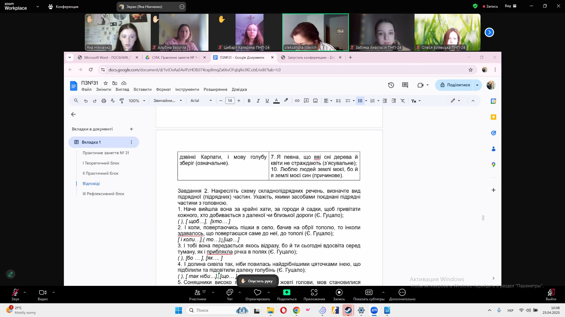 25.04.2025 о 9.30 відбулося практичне заняття з сучасної української мови з практикумом у групі ПНП-24, яке відвідала завідувачка кафедри доц. Павлик О.А. Першокурсники добре підготувалися і продемонстрували достатній рівень знань з теми: "Складнопідрядне речення". Під керівництвом викладача , доц. Лисевич О.В., група ПНП-24 не тільки поглибила свої знання, але й закріпила уміння конструювати речення за схемами, будувати схеми, тощо. Рефлексивний блок сприяв узагальненню та систематизації теоретичних знань і практичних умінь, що дозволило усвідомити студентам власний рівень і визначити подальші напрямки для вдосконалення.