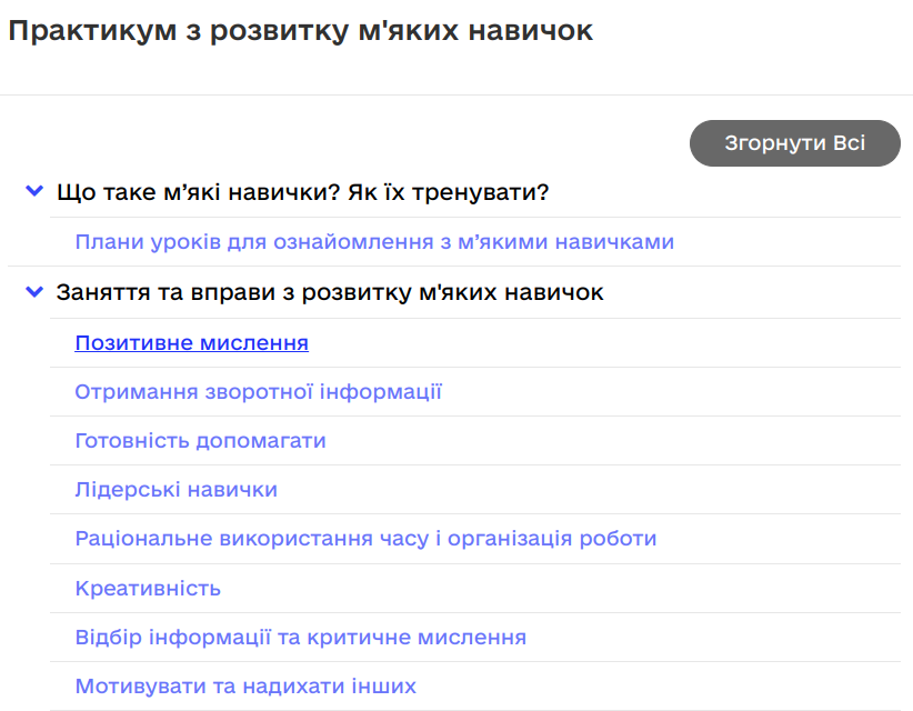 Пропонований онлайн-курс створено, враховуючи потребу розвитку універсальних компетентностей у межах програми ЄС «EU4Skills: Кращі навички для сучасної України», за підтримки МОН України й Фонду міжнародної солідарності (Польща). Курс містить 72 практичні заняття, що допоможуть сформувати більшість м'яких навичок, які необхідні для роботи за різними професіями, а також для побудови успішної кар’єри. Ці заняття передбачають практичні вправи, ділові ігри, сценарії групових занять, що сприяють формуванню окремої навички.