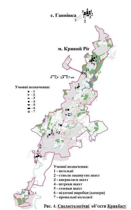 Умовні позначення до рис. 4. Типи підземних ГПЛ: Штольні: 1-5 - Кочубеєвські штольні; 6 - штольня старого кар'єру з видобутку аспідних сланців; 7 - штольня дореволюційного рудника Костянтинівського товариства; 8-9 - штольні в районі селища Рахманівка. Стволи шахт: 1 - ствол шахти Червоний Гірник колишнього РУ ім. Р. Люксембург; 2 - ствол шахти Північна колишнього РУ ім. Дзержинського; 3 - ствол шахти №5-Нова колишнього РУ ім. Ілліча; 4 - ствол шахти Валявко-Північна колишнього РУ ім. Ілліча; 5 - ствол шахти Валявко-Вентиляційна колишнього РУ ім. Ілліча; 6 - ствол шахти Нова колишнього РУ ім. Ілліча в селищі Рудничне; 7 - ствол дореволюційної шахти колишнього РУ Гервардт; 8 - ствол шахти ім. МЮД колишнього РУ Інгулецький; 9 - ствол шахти Південна-Вентиляційна колишнього РУ ім. Леніна. Квершлаги шахт: 1 - квершлаг старої шахти Північної Вентиляційної колишнього РУ ім. Фрунзе. Штреки шахт: 1-4 - в бортах двох провальних лійок колишнього РУ ім. Леніна; 5 - на східному борту кар'єра №3 Новокриворізького РУ ПАТ «АрселорМіттал Кривий Ріг». Гезенки шахт: 1 - в стелі квершлагу старої шахти Північної Вентиляційної колишнього РУ ім. Фрунзе. Підземні виробки: 1-2 - виробки південного торця Кочубеєвського кар'єру. Провальні колодязі: 1-2 - в районі колишнього РУ ім. Р. Люксембург - поля знесених шахт Комсомолка та Комсомольська-1. Матеріали підготував В.В. Коцюруба. |