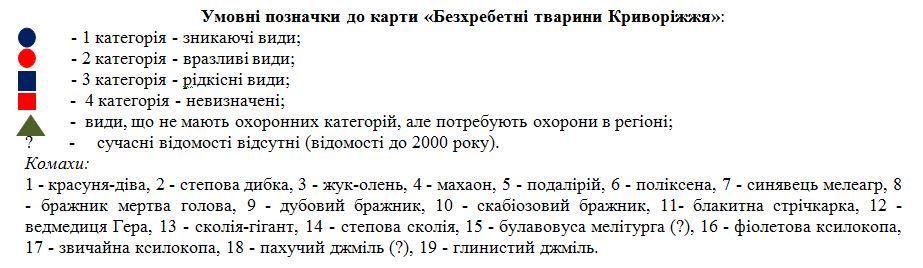 На складеній нами зоогеографічній карті Криворіжжя умовними позначками нанесені місця зустрічі значної кількості пріоритетних видів тварин Криворіжжя, насамперед тих, що мають природоохоронний статусу, або викликають великий пізнавальний інтерес (рис. 9.1). Всі місця знахідок тварин отримані нами з аналізу літературних джерел, наведених в монографії та результатів спостережень автора цього розділу.
