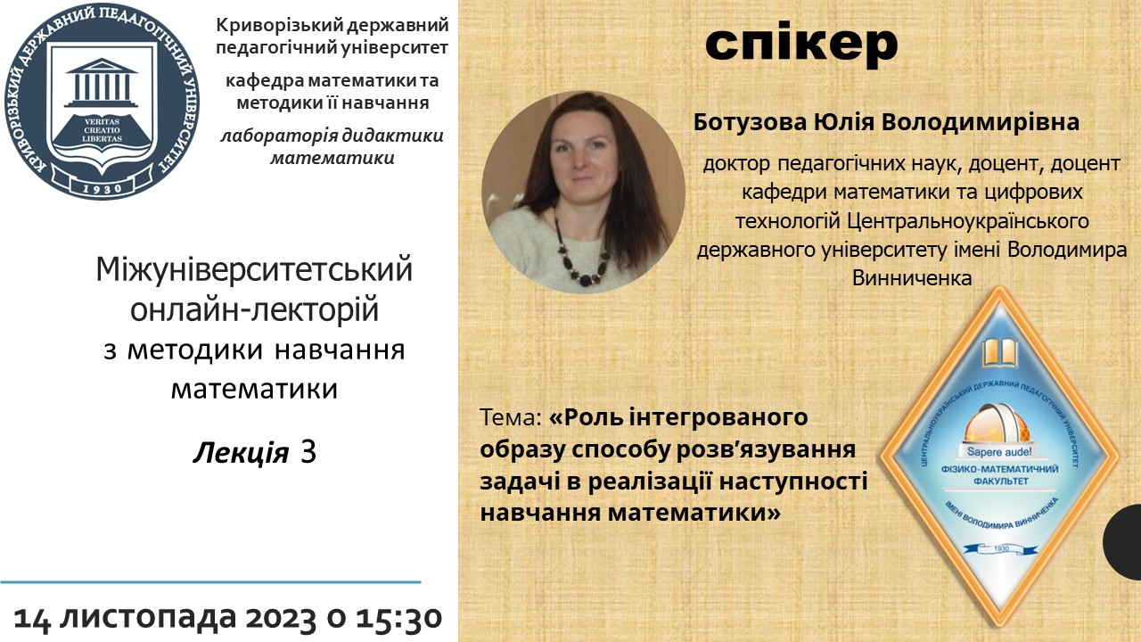 Зустріч 5Після літніх канікул лабораторія дидактики математики відновлює роботу і  у співпраці з науковцями Центральноукраїнського державного університету імені Володимира Винниченка пропонує студентам, яким цікава методика навчання математики, прийняти участь в роботі  міжуніверситетського онлайн-лекторію з методики навчання математики.