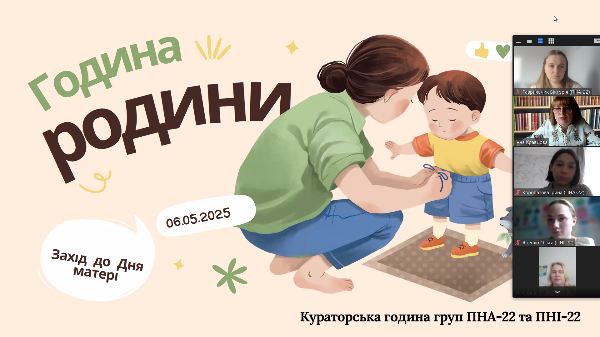 06.05.2025 у групах ПНА-22 та ПНІ-22 відбулась година родини. Виховна година, присвячена Дню матері, була надзвичайно зворушливою та наповненою теплом. Особливо приємно було те, що деякі мами змогли бути присутніми на заході та почути щирі слова вдячності від своїх дітей.
